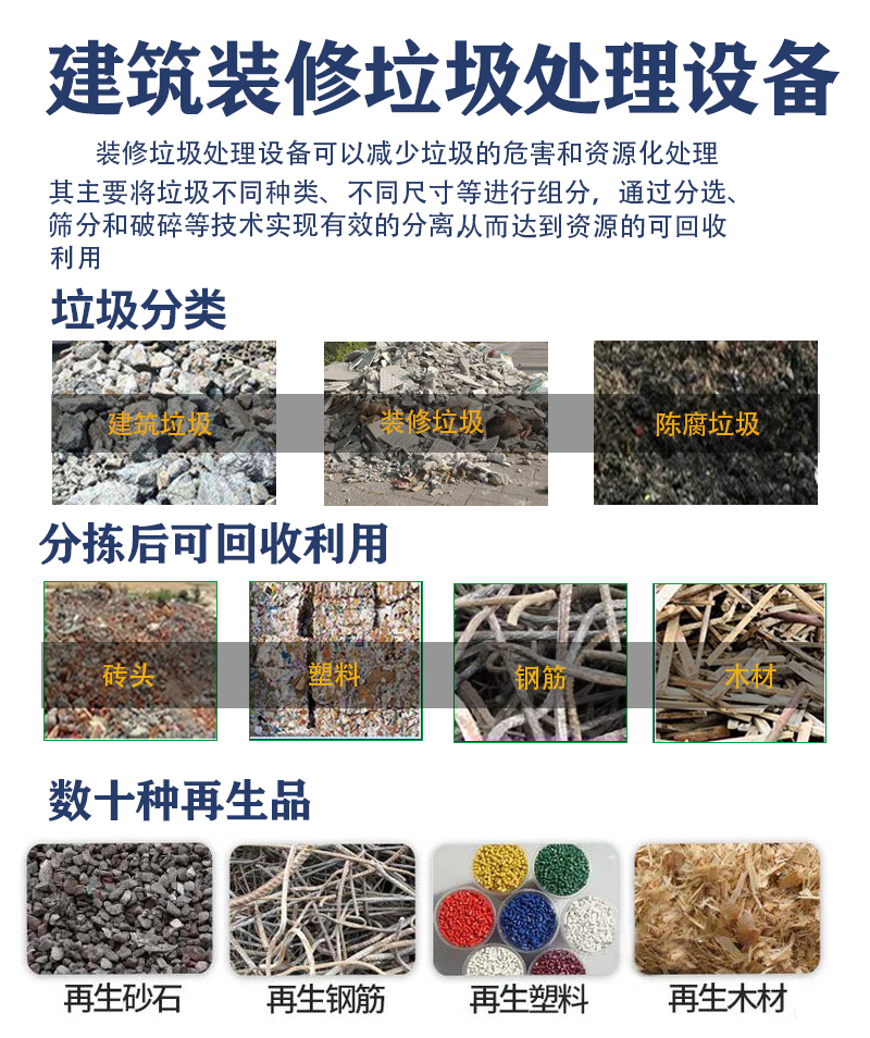建筑裝修裝潢垃圾是“錯位資源”,95%的垃圾可以替代不可再生的天然砂石等資源。鑒于建筑裝修裝潢的可循環(huán)再利用,各地逐步開展建筑裝修裝潢垃圾回收項目,建筑裝修垃圾處理設(shè)備應(yīng)運而生。