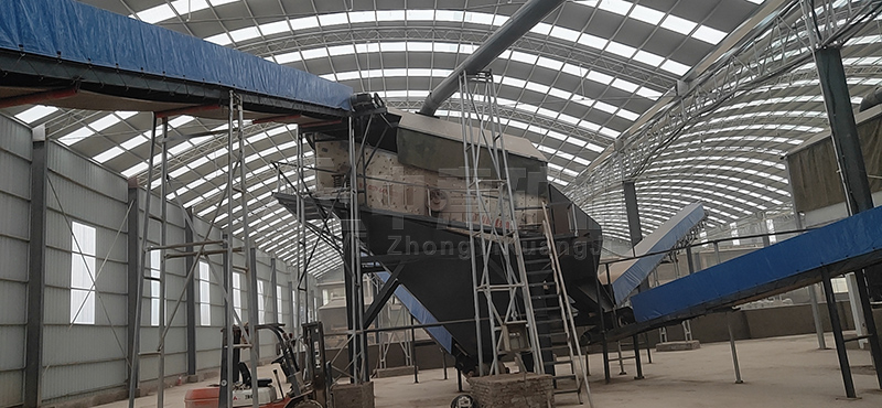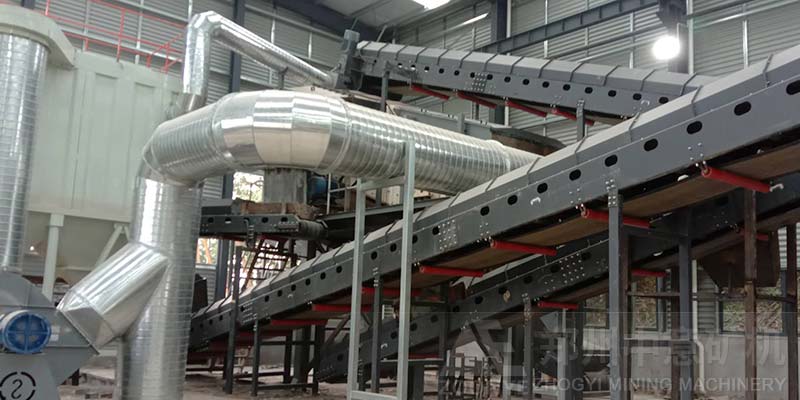 原料用卡車直接倒進筒倉,通過振動給料機均勻送至C型顎破碎機。C型破碎機,用于原材料的初級粉碎。然后用帶式輸送機運輸到建筑垃圾破碎機的*垃圾箱。 2.用卡車將磚混結構(≤500 mm)的建筑廢料直接送入料倉,用振動給料機均勻輸送建筑垃圾*破碎機。破碎物料(除鐵)由帶式輸送機送至滾筒分離器,將集料與散料分離,分選后小于140 mm的集料進入下一工序。大于140 mm的物料進入空分平臺進行輕物料去除空分,集料進入建筑廢料*破碎機再進行破碎。物料小于140 mm,從帶式輸送機到篩分車間二樓進行篩分,篩分車間有兩種篩分系統,即0~10 mm燒結磚原料。另外,將10~20 mm、20~30 mm和30 mm以上的三種集料分別分離成三臺負風壓機,空分后的集料再通過帶式輸送機輸送到浮選機上,再分離出輕物質。浮選物料進入成品篩分系統,分離0-5、5-10、10-20、20-31.5mm集料.大于31.5mm的物料進入單缸液壓錐底部破碎,破碎材料和浮選材料一起進入成品篩。