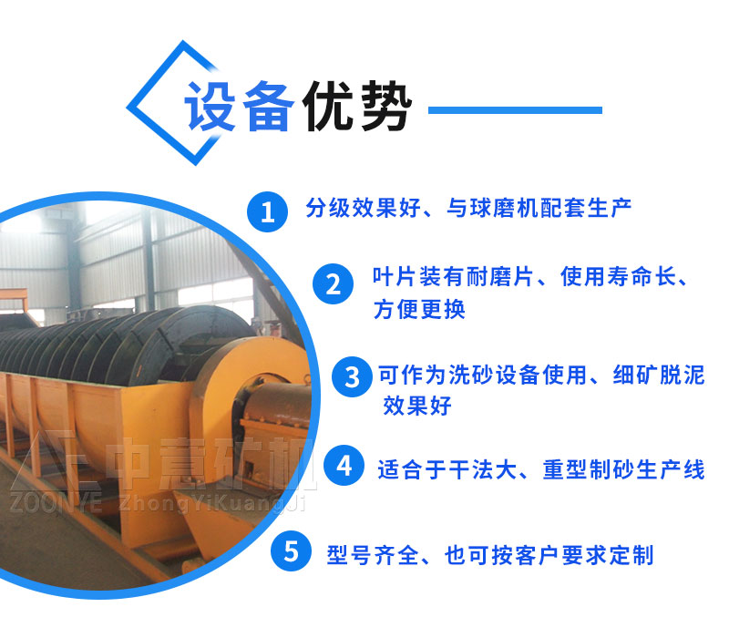 螺旋分級機主要由傳動裝置、螺旋體、槽體、升降機構、下部支座(軸瓦)和排礦閥組成。