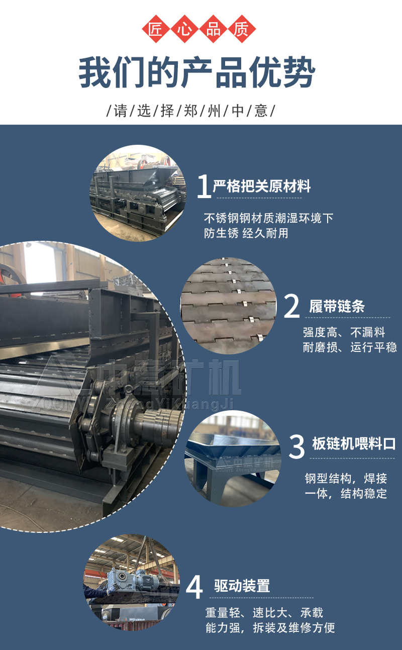 鏈板喂料機是積累了多年制造經驗研發的一種喂料設備。由驅動鏈輪裝置、張緊鏈輪裝置、運載機構、機架、防護罩、送料輥輪、回程輥輪等組成。喂料機尾部裝置采取特殊設計,特別適用于粘性大的物料,不會聚積尾部而造成鏈條出現跳齒現象,而且給料量大小可調。具有結構簡單,造價低,維修方便,可承受大塊物料的沖擊,節約原料,使用壽命長,噪音小等優點。適合大型及中型礦山、磚廠、建材、化工等行業。鏈板喂料機、鏈板喂料機、鏈板喂料機廠家規格,長度可根據客戶的現場尺寸定作。